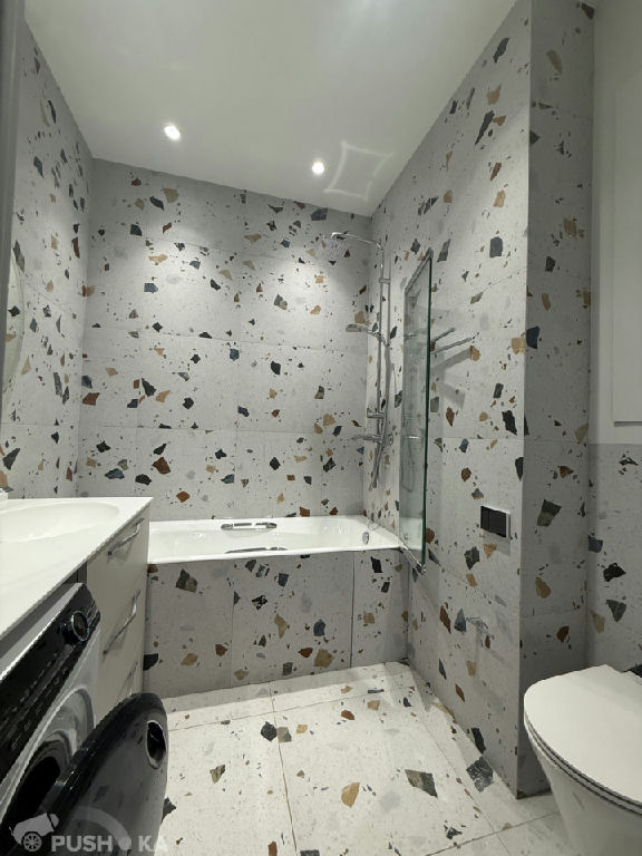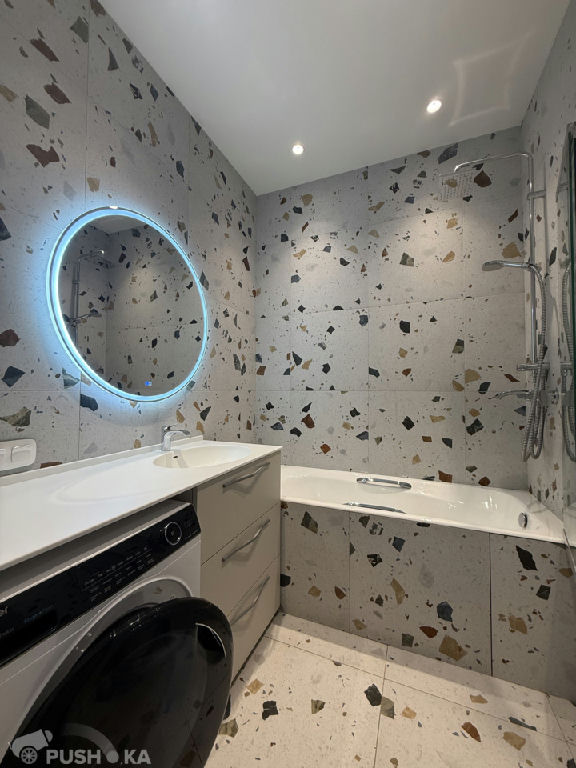 Совмещенный санузел: чугунная ванна и инсталляция Jacobs Delafon, смесители Hansgrohe, система протечек Нептун.